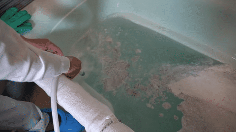 弊社独自の洗浄剤と機材、そしてノウハウにて施工を開始いたします。時間的には基本的に2時間程度です。除菌作業と汚れを吐き出す洗浄作業を交互に実施いたします。